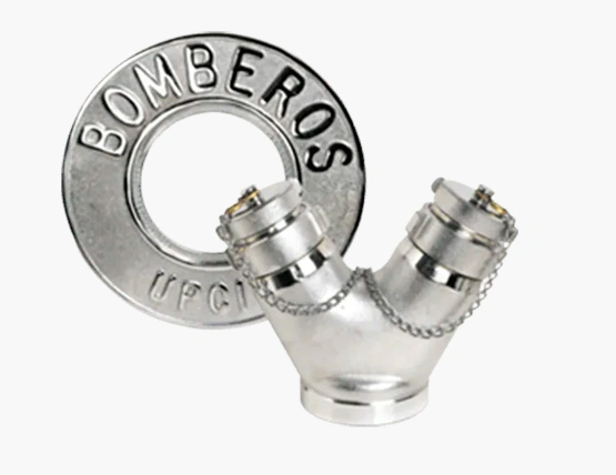 Fabricada en bronce, con un juego de tapones que se encuentran sujeto con una cadena, cuenta con un sistema de no regresión de agua a través de chapaletas colocadas en cada entrada, cuenta con disco con la leyenda Bomberos, su acabado es en bronce cromado.