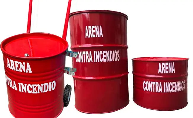 Están fabricados de lámina , cuentan con un acabado color rojo bermellón con la leyenda de “ARENA CONTRA INCENDIO” y tienen una capacidad de almacenaje de 100 kg o 200 kg, de arena sílica contra incendio, especial para sofocar incendios.